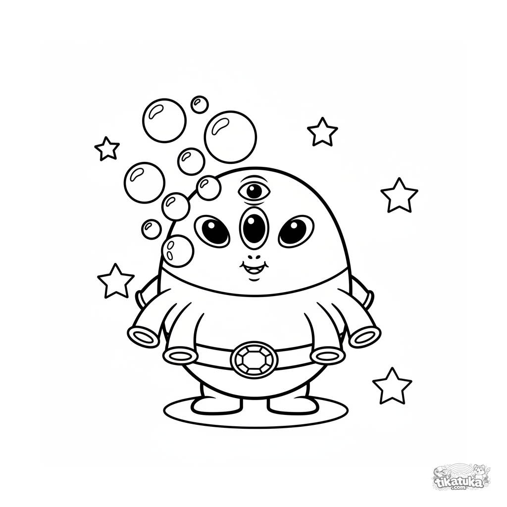 Раскраска для малышей: милый пухлый инопланетянин дует мыльные пузыри среди звёзд. Простые формы, широкие поля, идеально для первых карандашей.