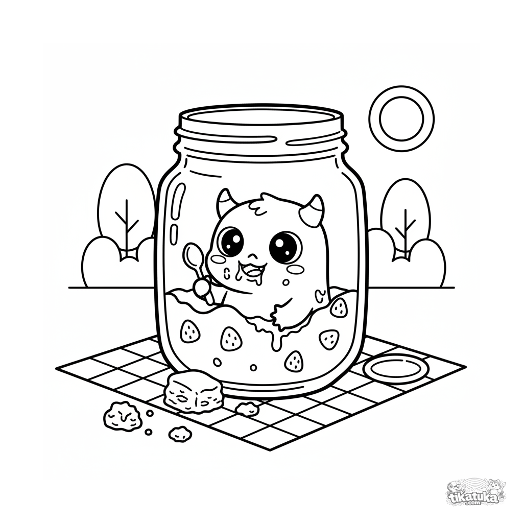 Раскраска для детей 4-6 лет: крошечный рогатый монстр прячется в банке с джемом на пикнике. Забавный сюжет, четкие контуры.