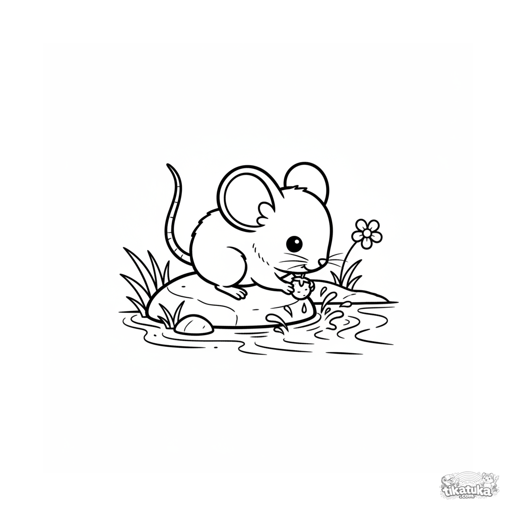 Милая раскраска в стиле чиби для детей 4-6 лет: крошечная полевая мышь пьёт воду из ручья, сидя на камне и держа в лапках дикую ягодку.