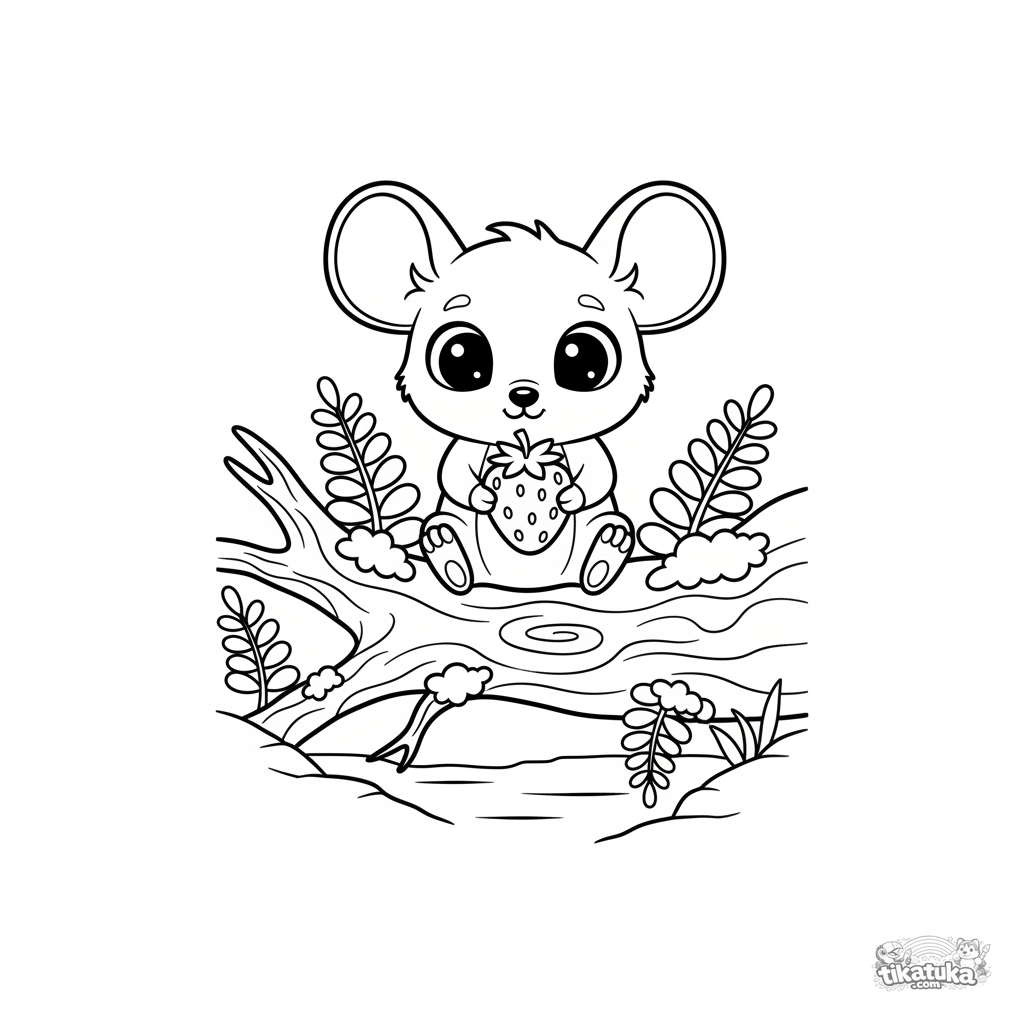 Простая раскраска для малышей 2-3 лет: крошечная полевая мышь с большими глазами сидит на корне дерева у ручья и держит в лапках лесную землянику, формы очень простые.