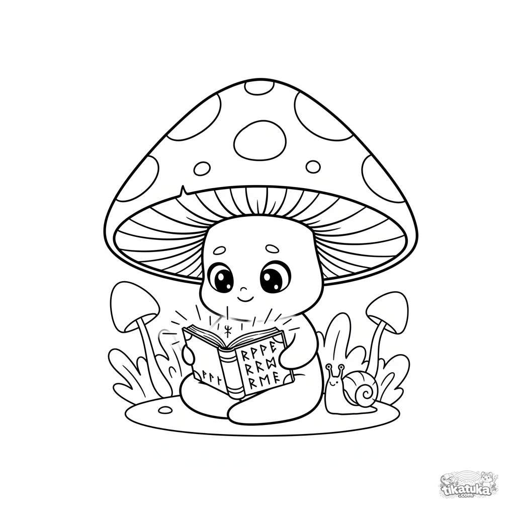 Раскраска для детей 4-6 лет: грибной спрайт читает волшебную книгу под огромным мухомором в зачарованном лесу.