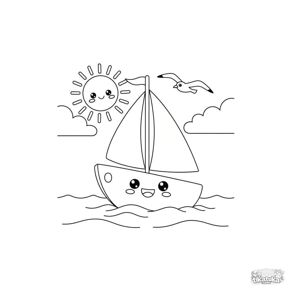 Раскраска для детей 4-6 лет: милая маленькая яхточка с улыбающимся лицом плывет по бескрайнему, спокойному океану под лучами солнца. Яркий и добрый сюжет.