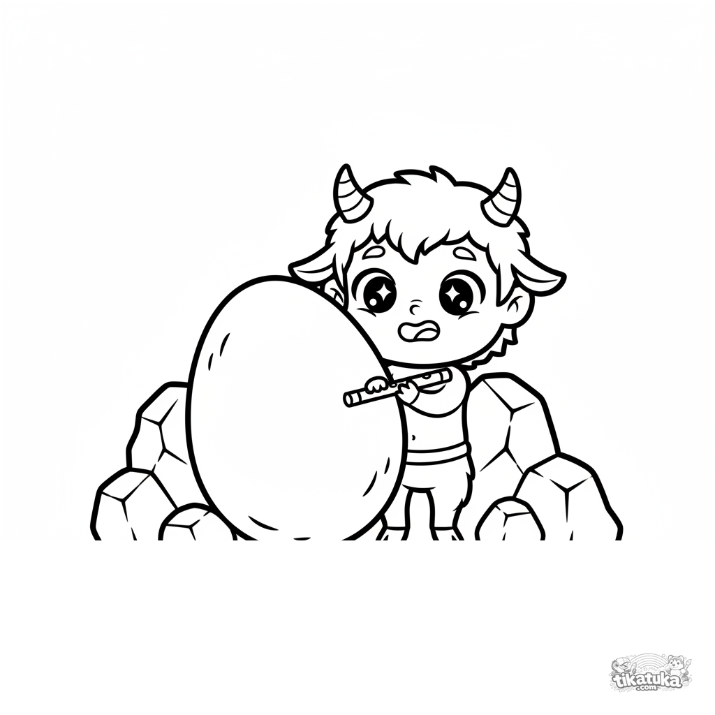 Раскраска для малышей 2-3 года: маленький сатир с рожками и копытцами прячется за каменным яйцом в логове Горгоны. Простые крупные формы, милое выражение лица.