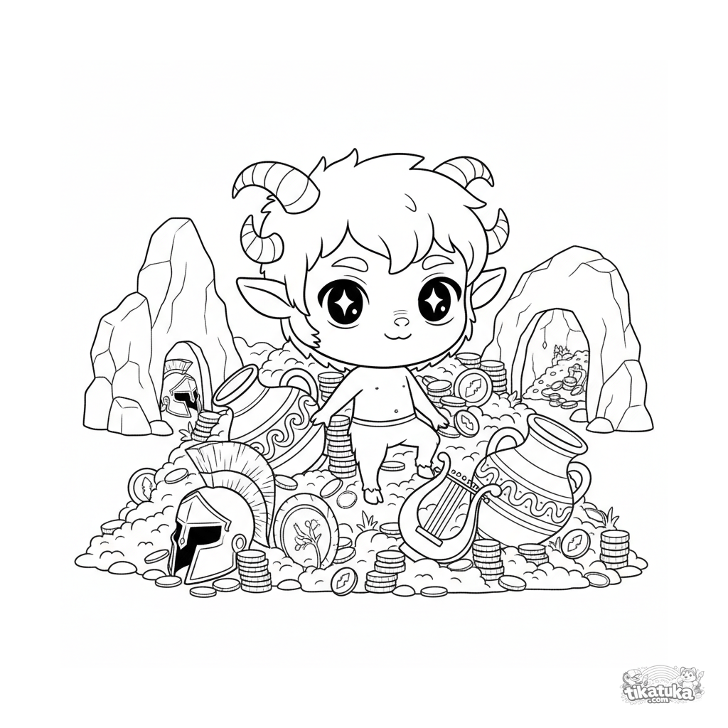 Раскраска: озорной сатир в логове Горгоны. Для детей 4-6 лет. Милый мифический персонаж выглядывает из-за кучи древних сокровищ.