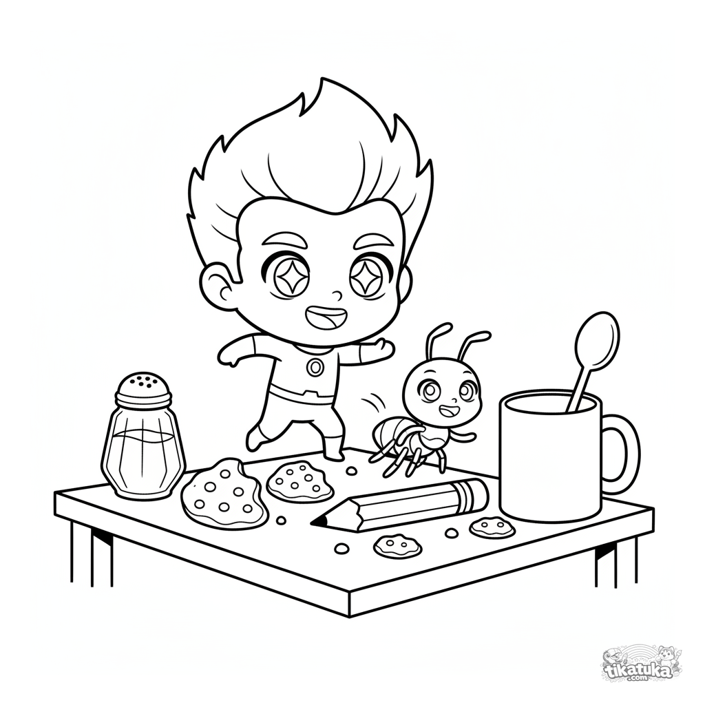 Раскраска для детей 4-6 лет: крошечный супергерой исследует гигантский кухонный стол вместе с муравьиным напарником.