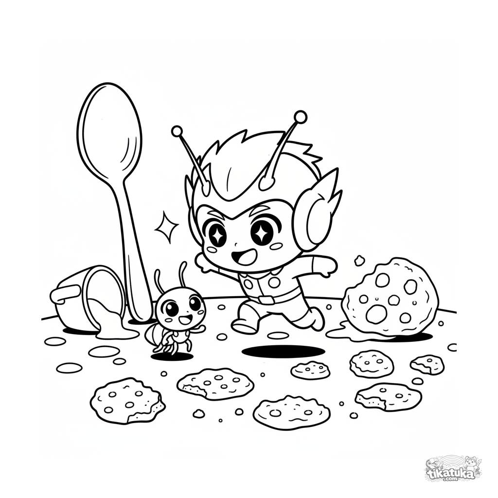 Раскраска для детей 4-6 лет: крошечный супергерой в жёлтом костюме прыгает по гигантскому кухонному столу с муравьём-напарником. Весёлое приключение в огромном мире.