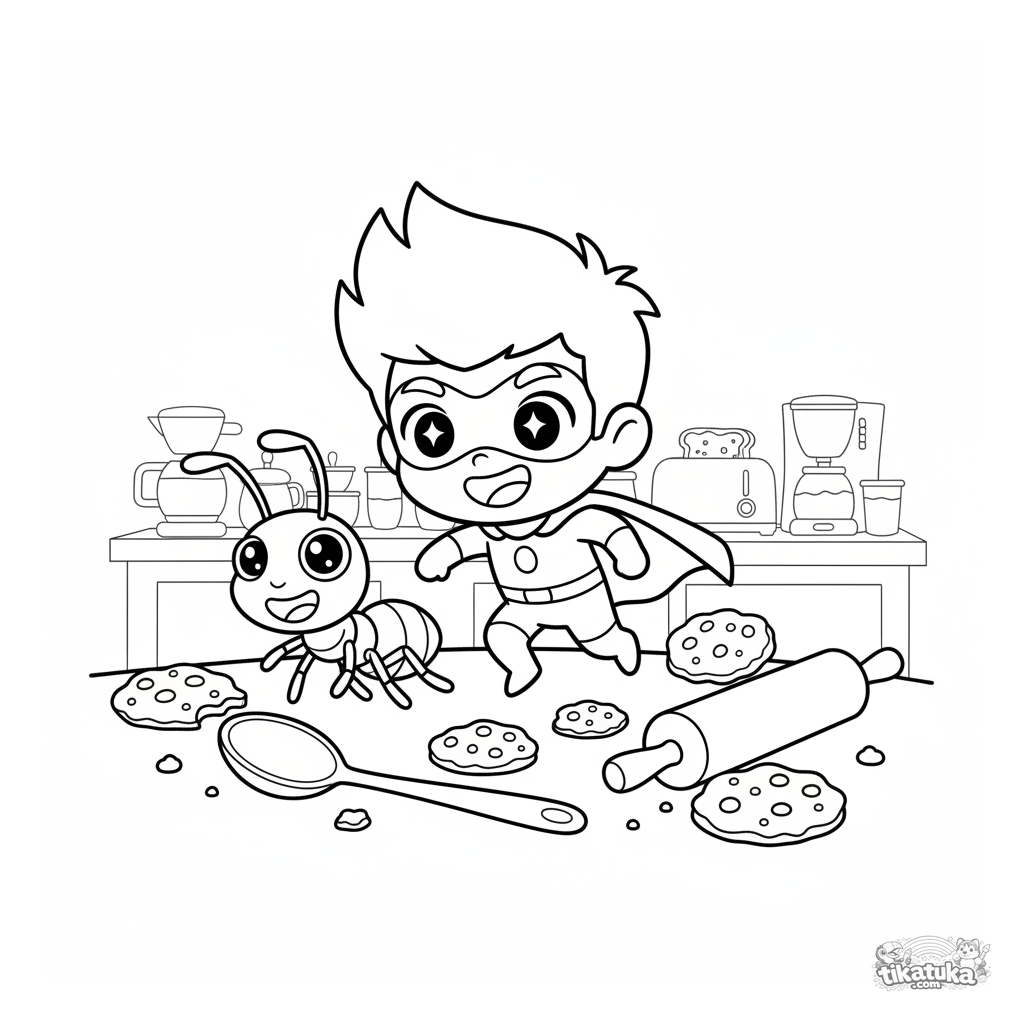 Раскраска для детей 4-6 лет: крошечный супергерой в жёлтом костюме прыгает по гигантскому кухонному столу рядом с муравьём-напарником.