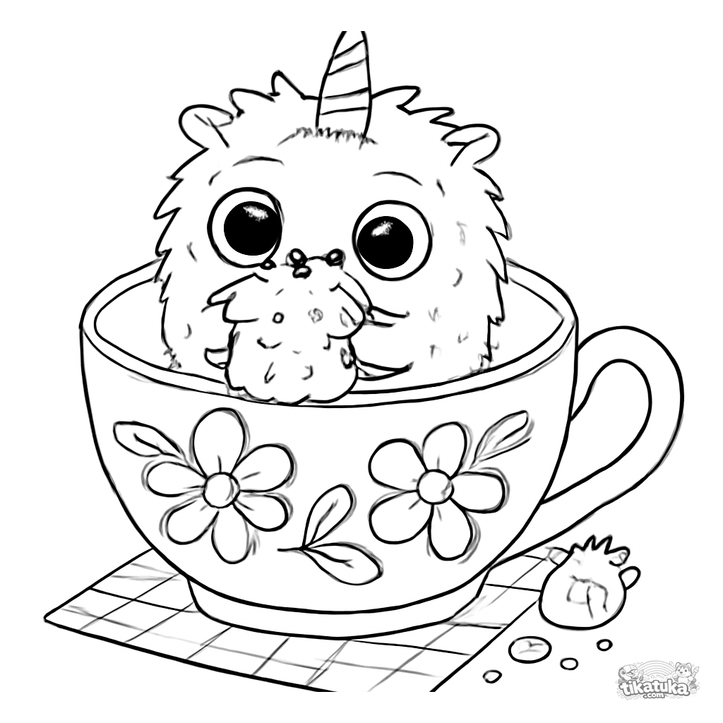 Раскраска с крошечным однорогим монстром, устроившим пикник в большой чашке. Для детей 3-6 лет, с деталями вроде печенья и салфетки в клетку.
