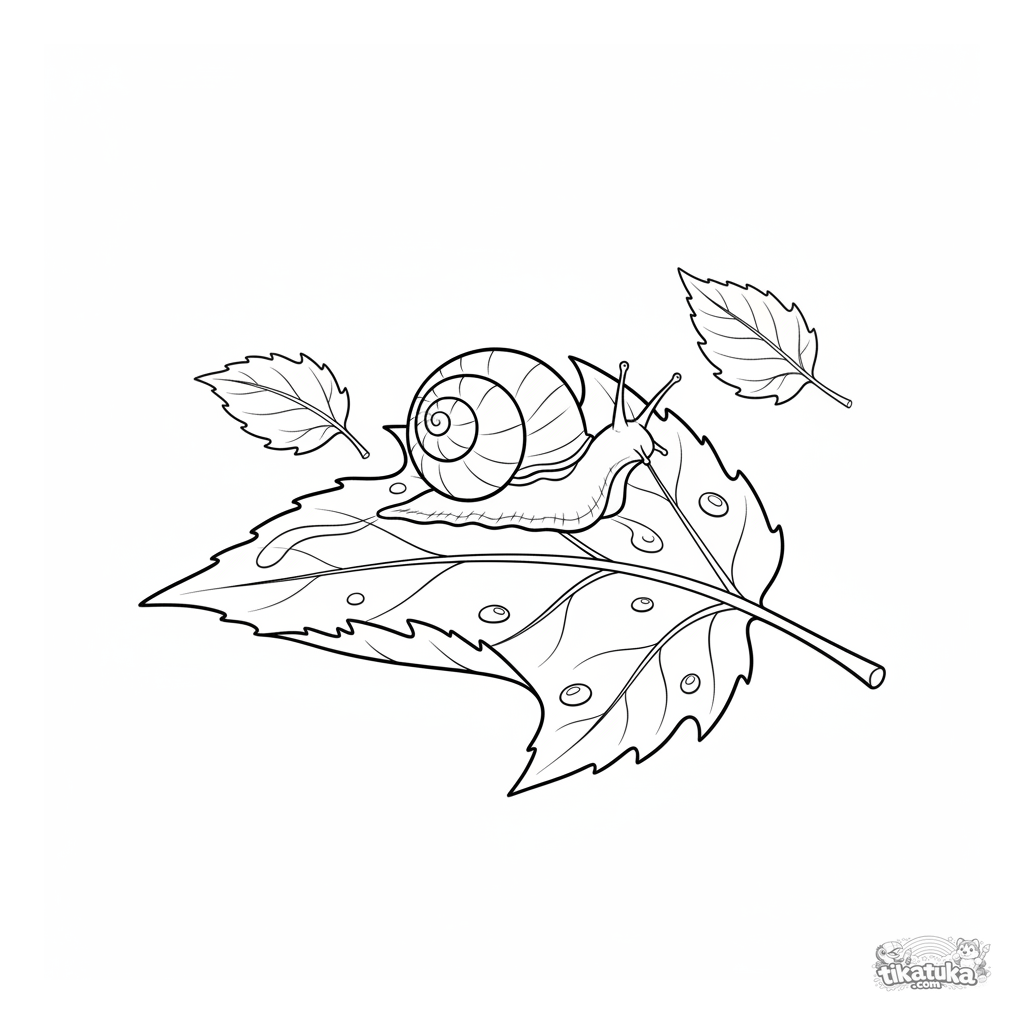 Раскраска для детей 4-6 лет: маленькая улитка ползет по мокрому кленовому листу после дождя. Детали раковины, капли воды, природная сцена.
