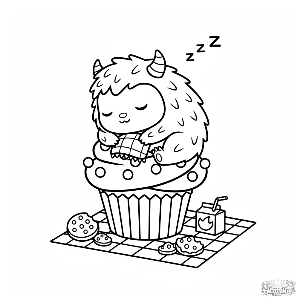 Раскраска для малышей: крошечный колючий монстр сладко спит на большом кексе на пикнике. Крупные простые формы, для детей 2-3 лет.