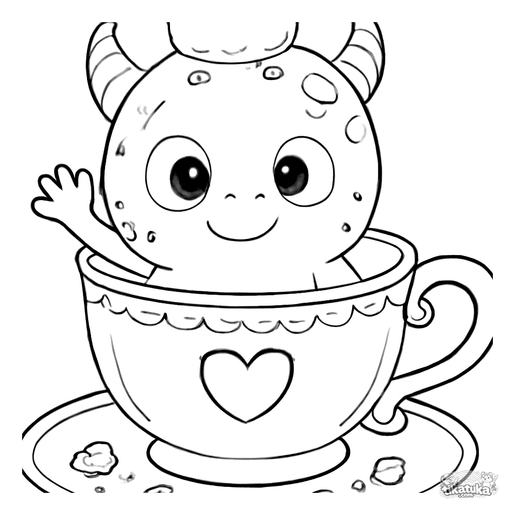 Раскраска с крошечным пятнистым монстром в чашке. Для малышей 2-5 лет. Милый монстрик в бумажной короне машет лапкой, вокруг рассыпаны крошки.