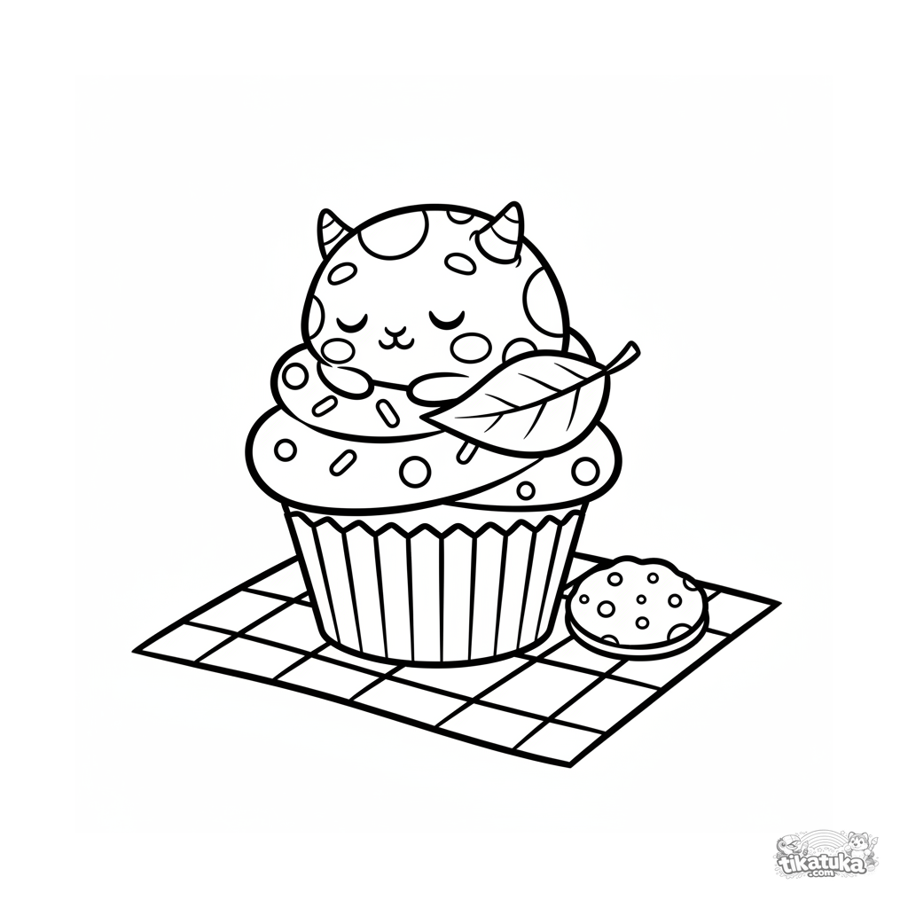 Простая раскраска для малышей 2-3 лет: крошечный монстрик сладко спит на большом кексе во время пикника. Крупные формы, чёткие контуры.