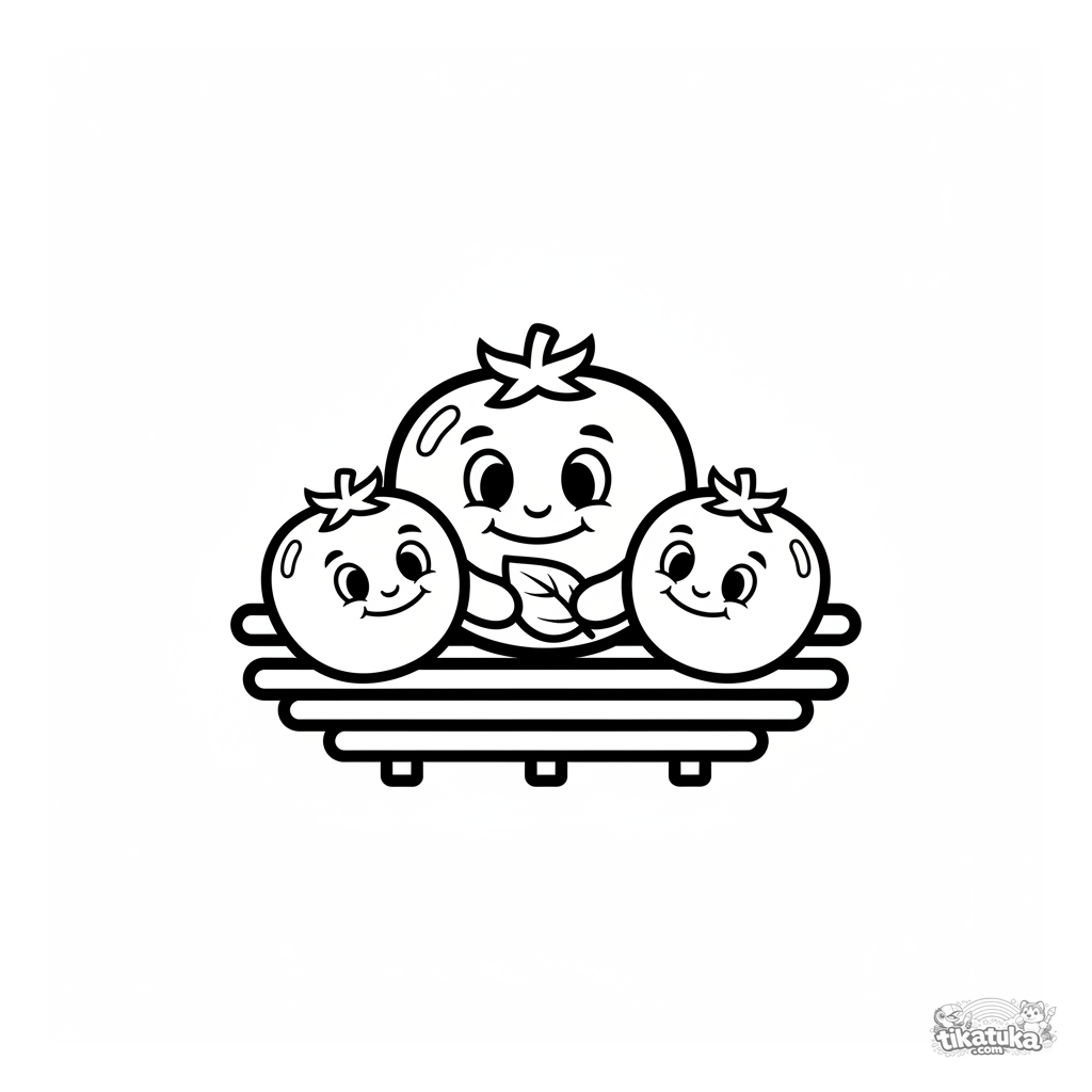 Раскраска для малышей 2-3 года: семейка улыбающихся помидорок-черри на решётке садового гриля. Очень простые формы, крупные детали, широкие поля.