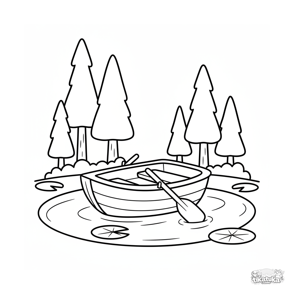 Раскраска для малышей: маленькая деревянная лодочка на спокойном лесном озере в тумане. Простые формы и широкие поля для легкого раскрашивания.