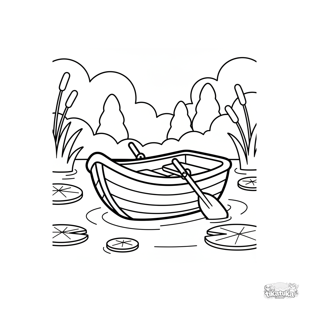 Раскраска для малышей: маленькая деревянная лодочка плывет по спокойному туманному озеру. Простые формы и широкие поля идеальны для первых занятий с карандашами.