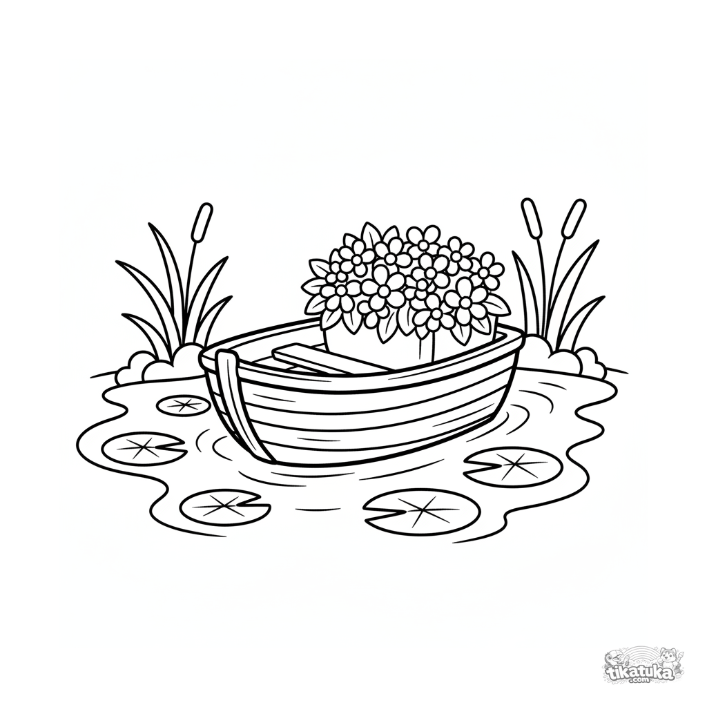 Раскраска для малышей: маленькая деревянная лодочка с цветами плывет по спокойному деревенскому пруду. Простые формы, широкие поля.