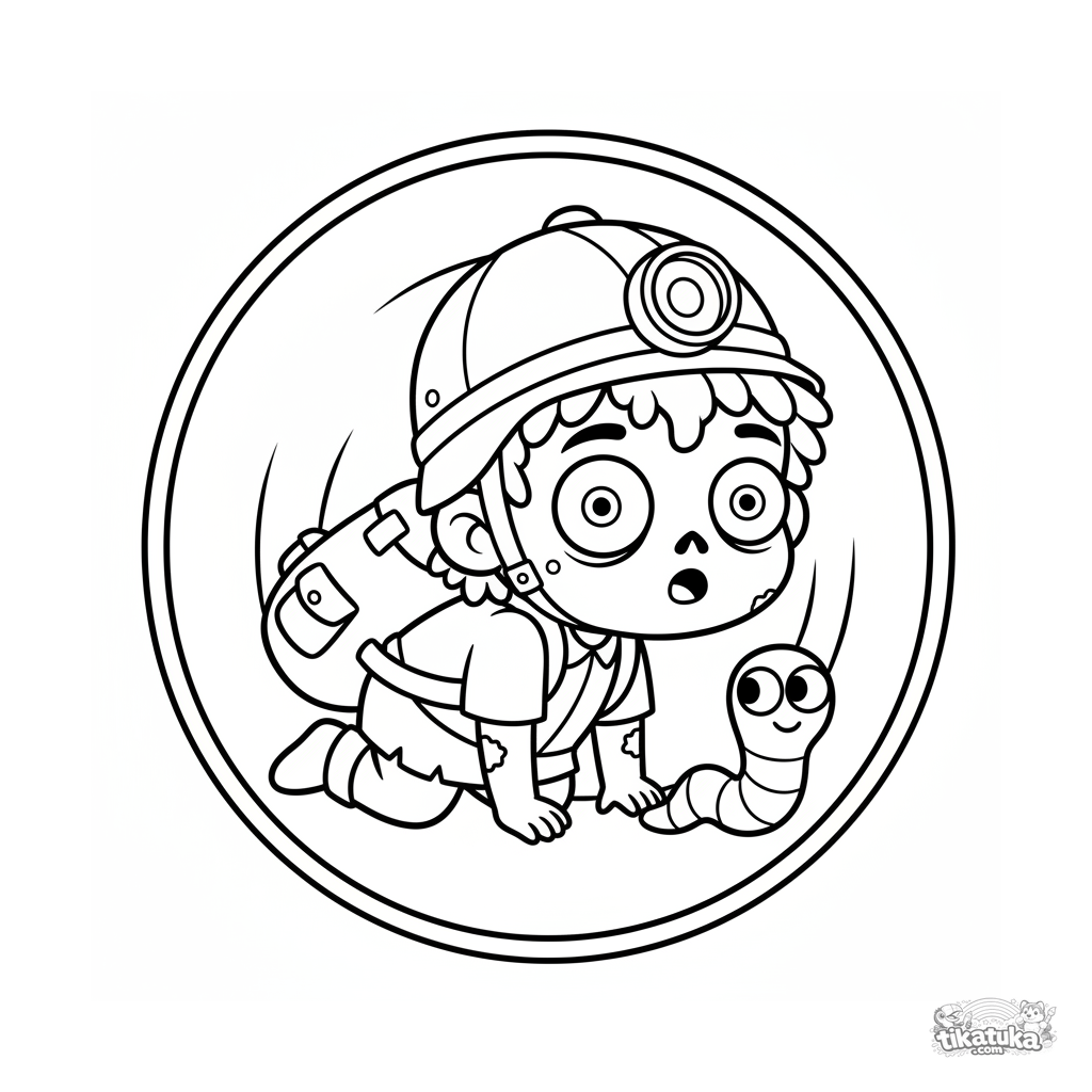Простая раскраска для малышей 2-3 лет: крошечный зомби-исследователь ползет по большой канализационной трубе. Крупные формы, широкие поля.