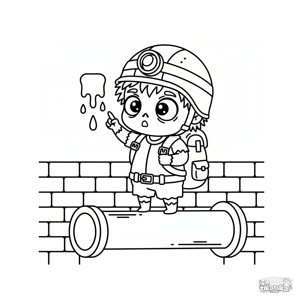 Простая раскраска для малышей 2-3 лет: маленький зомби-исследователь в канализационном коллекторе. Крупные формы, минимум деталей.