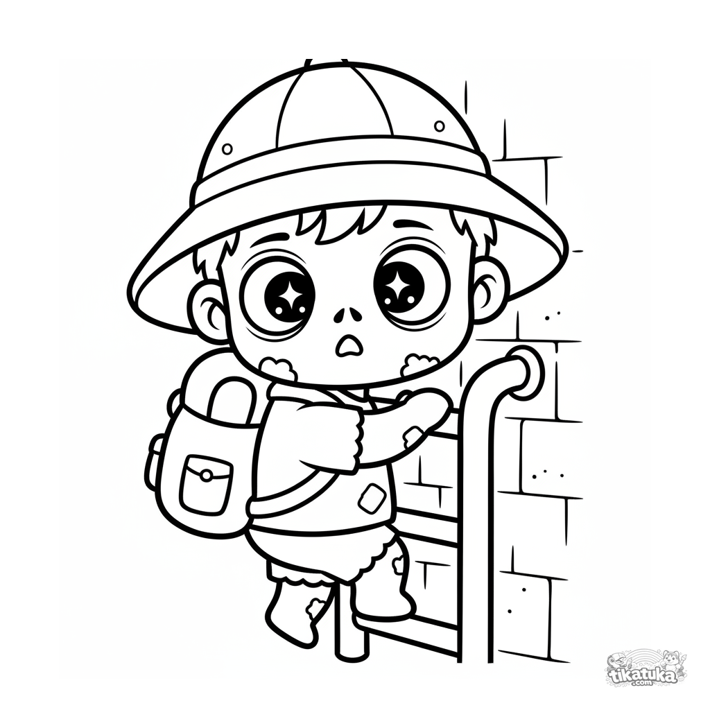 Раскраска для малышей 2-3 лет: крошечный зомби-исследователь спускается по лестнице в канализацию. Простые крупные формы, идеально для первых карандашей.