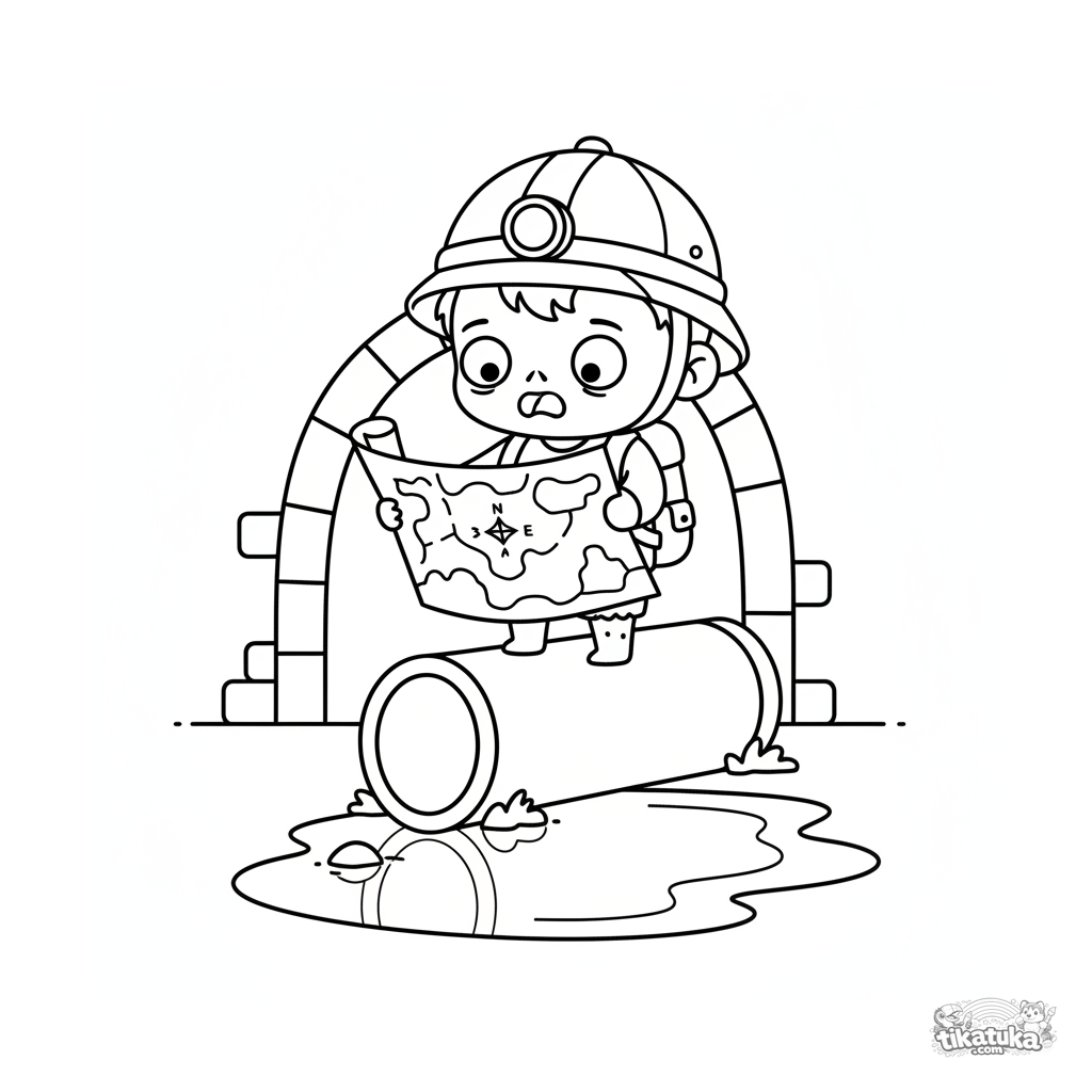 Простая раскраска для малышей: крошечный зомби-исследователь с картой в канализационном коллекторе. Крупные формы, мало деталей, широкие поля для раскрашивания.