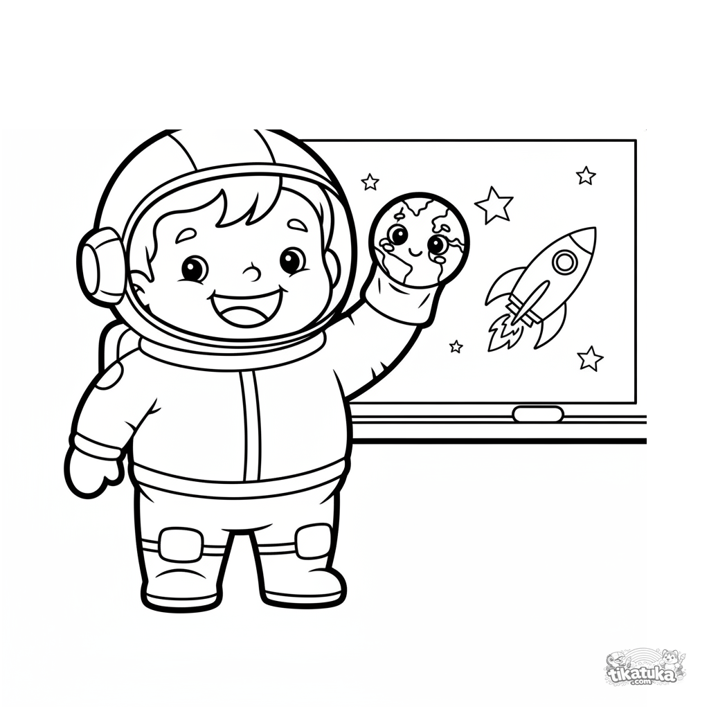 Простая раскраска для малышей 2-3 года: космонавт показывает кукольный спектакль у доски в классе. Крупные четкие формы, широкие поля, дружелюбный персонаж.