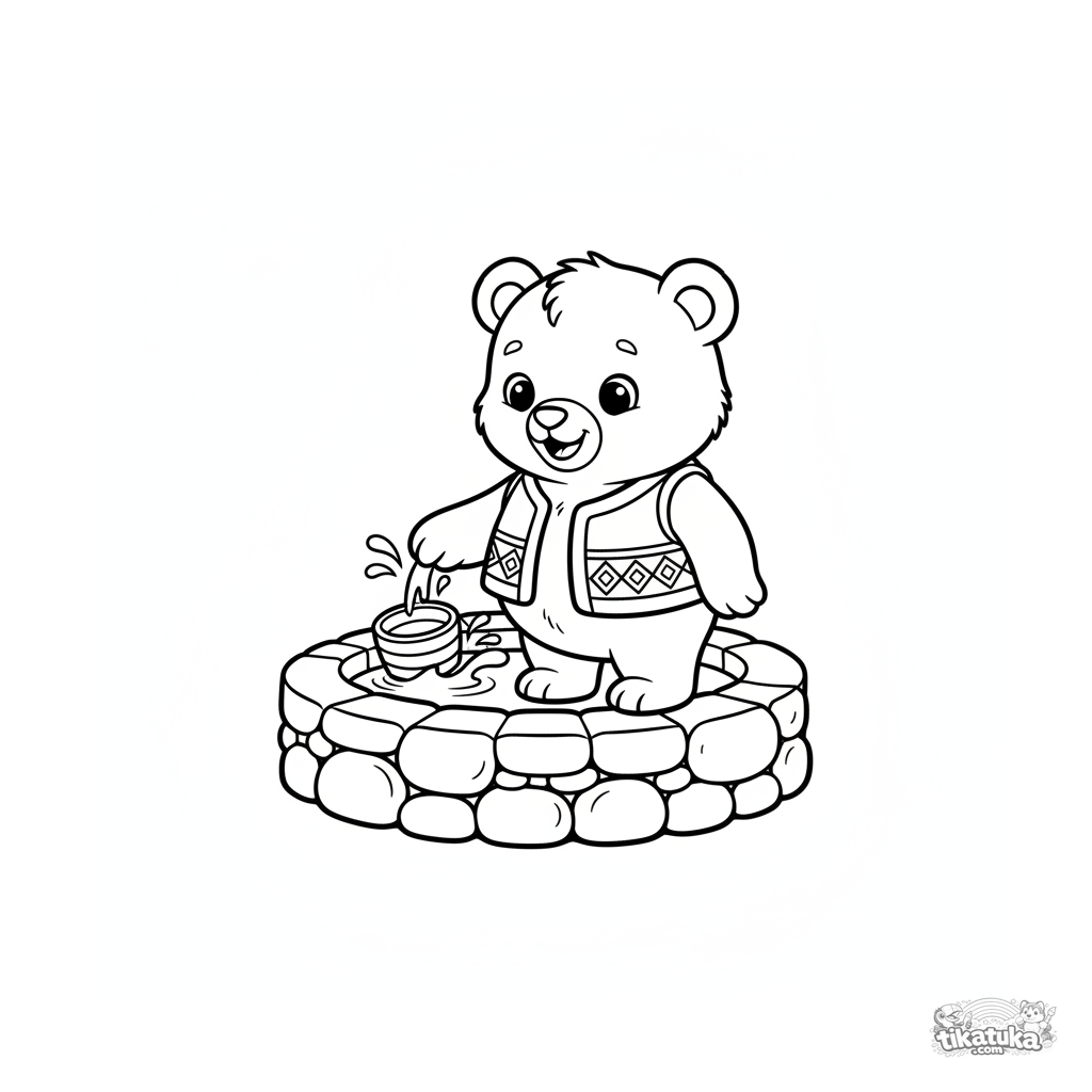 Простая раскраска для малышей 2-3 лет: милый медвежонок в жилетке играет у колодца с живой водой. Крупные формы, толстые контуры, мало деталей.