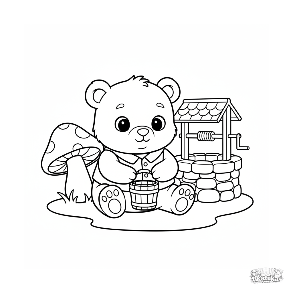 Очень простая раскраска для малышей 2-3 лет: милый медвежонок с ведерком у колодца. Крупные формы, толстые контуры, минимум деталей, идеально для первых карандашей.