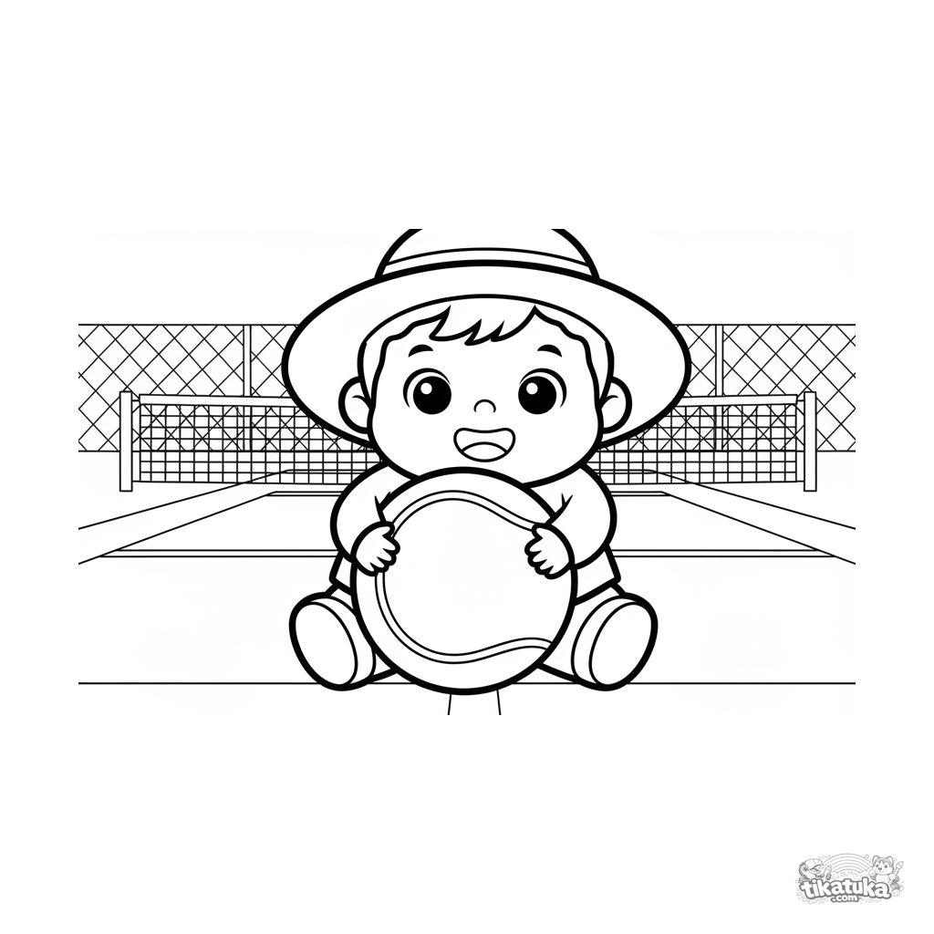 Раскраска для малышей 2-3 лет: счастливый ребёнок обнимает огромный теннисный мяч на корте. Огромные простые формы и минимум деталей для самых маленьких.