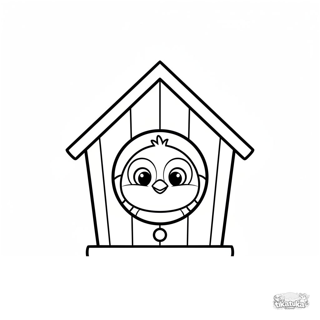 Очень простая раскраска для малышей 2-3 лет: милая синяя птичка выглядывает из скворечника. Крупные формы, толстые контуры, идеально для первых карандашей.