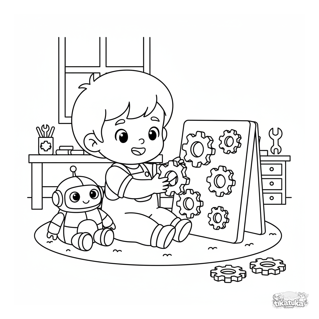 Простая раскраска для малышей 2-3 лет: мальчик в комбинезоне играет с большой игрушкой-сортировщиком шестеренок в секретной лаборатории.