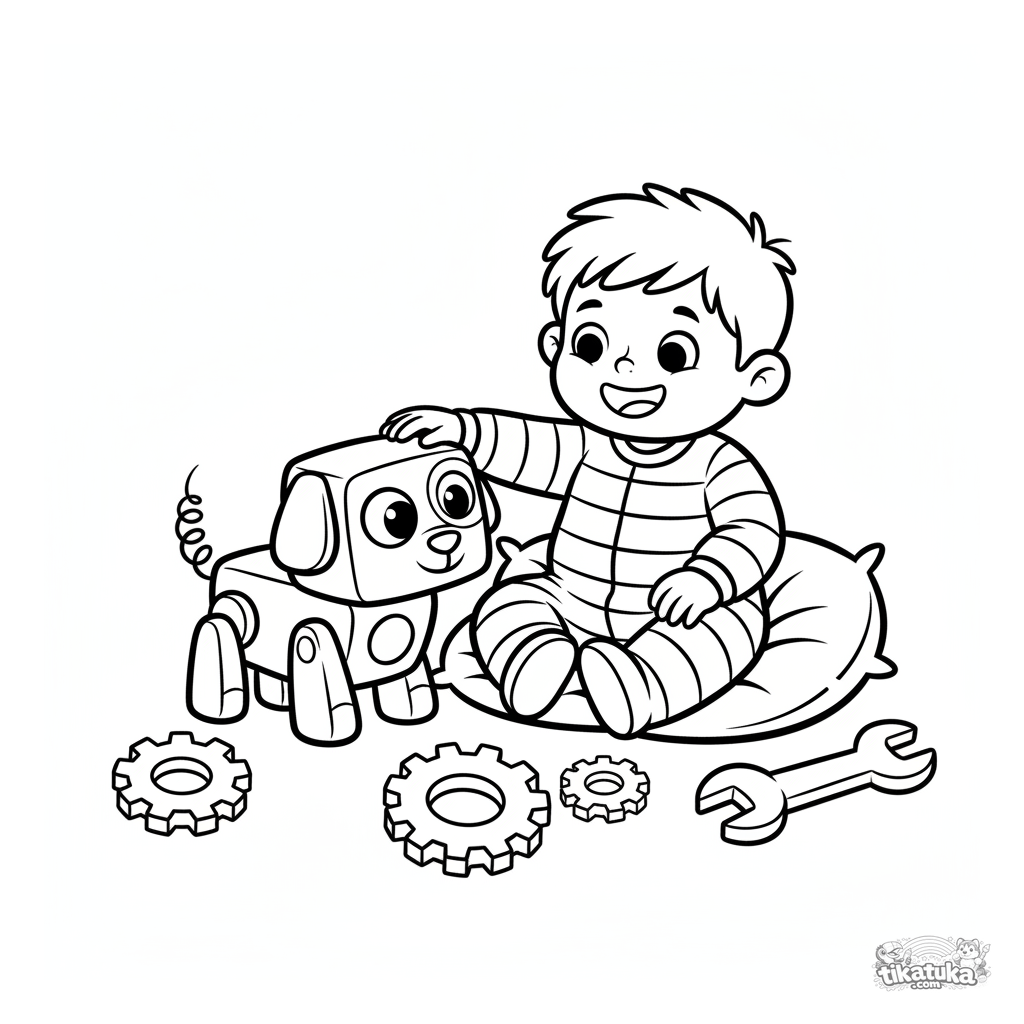 Простая раскраска для малышей 2-3 лет: мальчик в ползунках играет с роботом-собакой в секретной лаборатории изобретателя.
