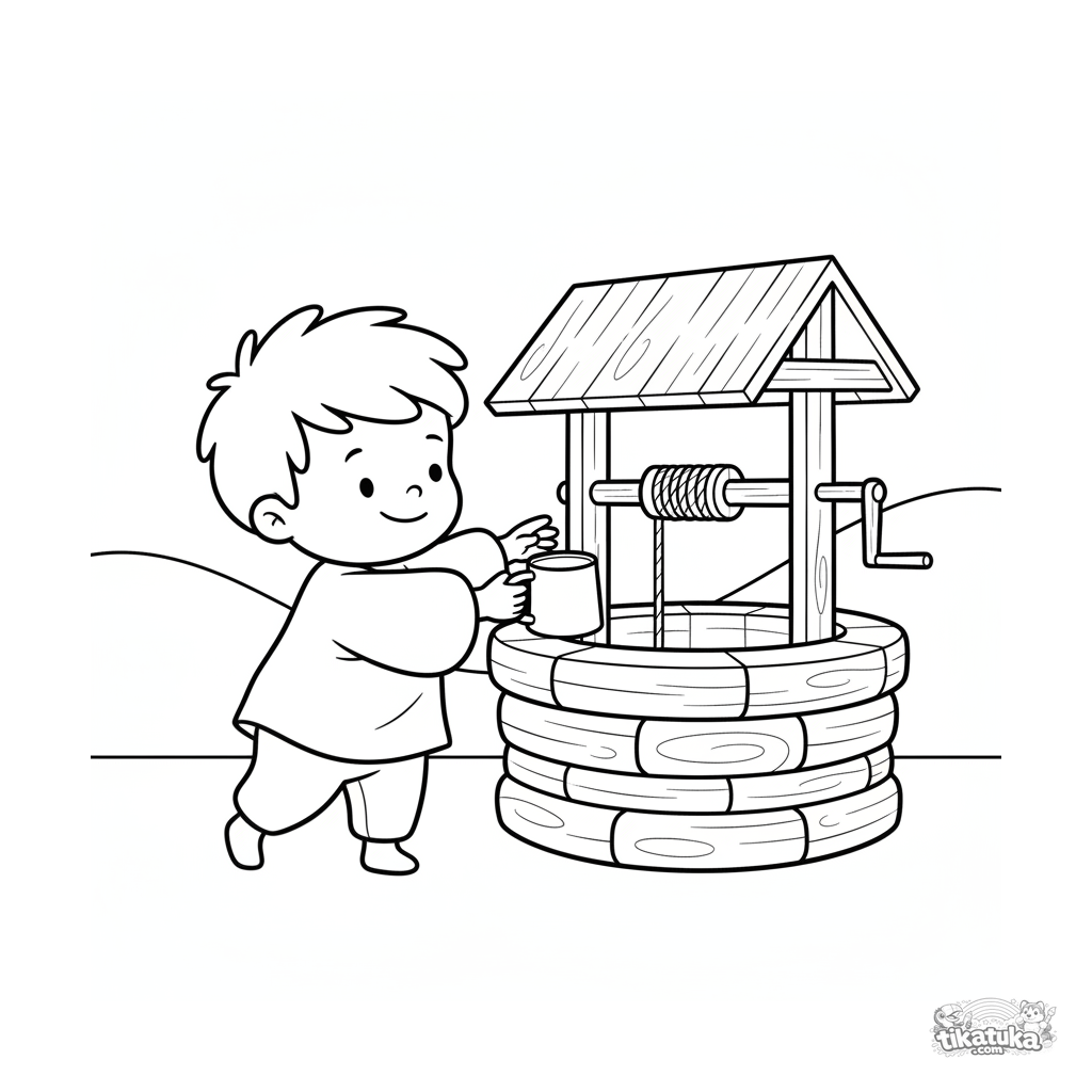 Раскраска для малышей 2-3 года: маленький мальчик с кружкой у колодца. Очень простые, крупные формы, толстые контуры, идеально для первых карандашей.