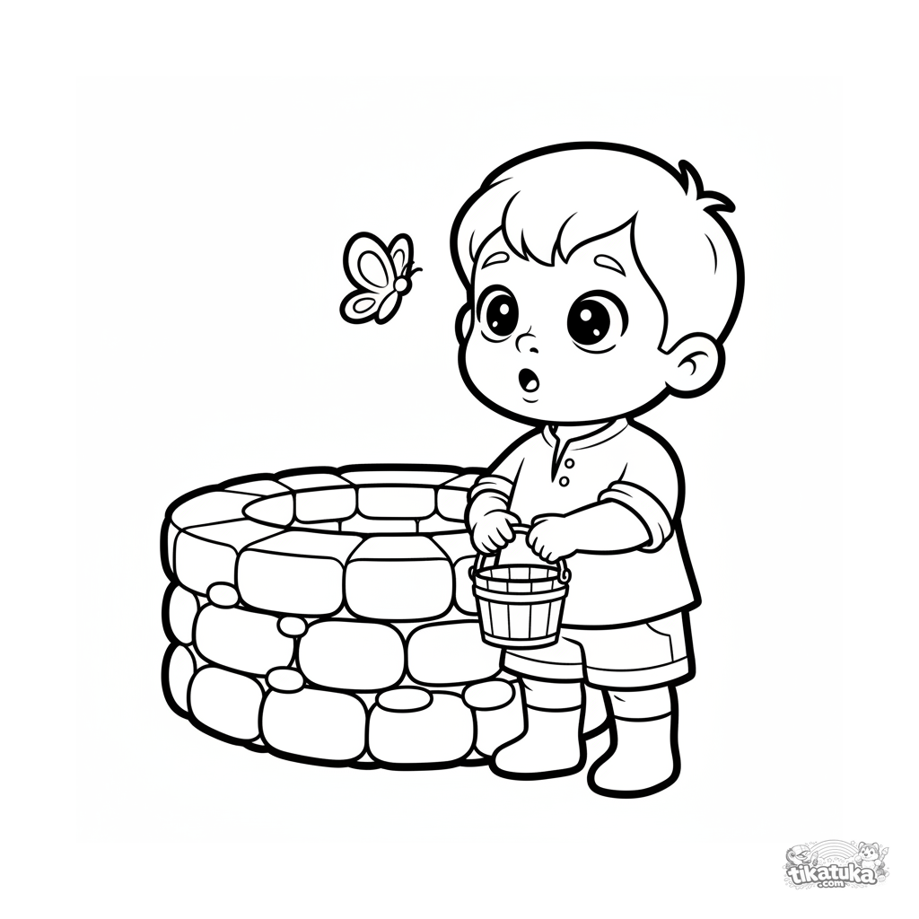 Очень простая раскраска для малышей 2-3 года: мальчик с ведёрком стоит у колодца. Крупные четкие формы, много свободного места для раскрашивания.
