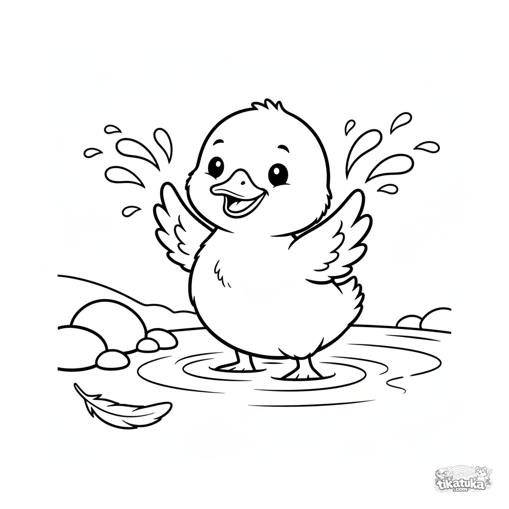 Простая раскраска для малышей 2-3 года: пушистый утенок весело плещется в прозрачном ручейке. Крупные четкие формы, широкие поля для первого раскрашивания.