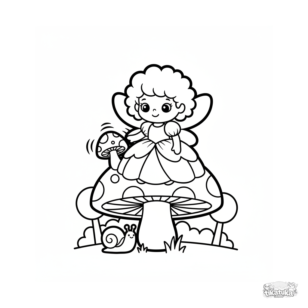 Простая раскраска для малышей 2-3 лет: милая фея-принцесса на грибочке в лесу. Крупные формы и широкие поля для первых карандашей.