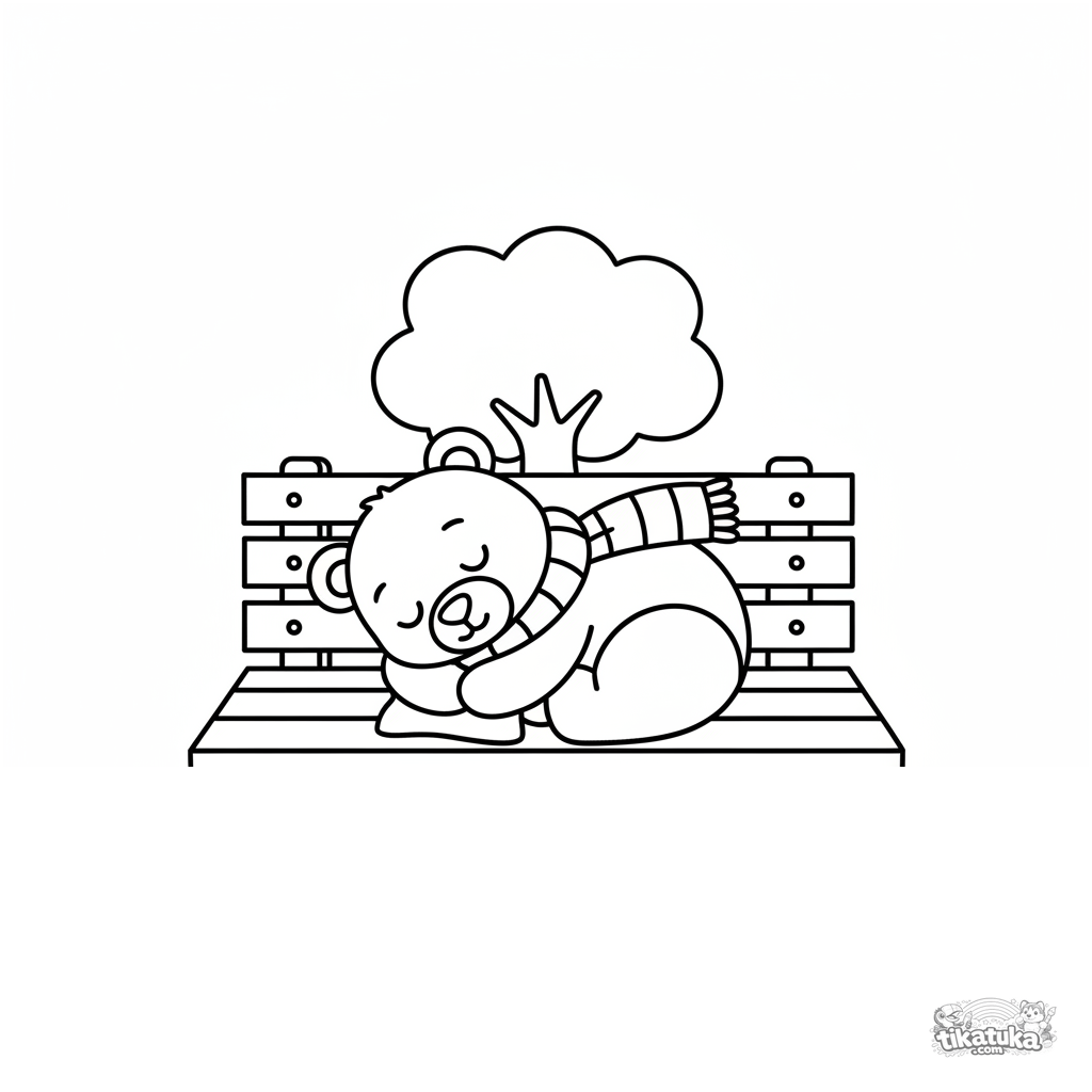 Простая раскраска для малышей 2-3 лет: плюшевый мишка спит на скамейке в парке. Крупные формы и широкие поля для первого творчества.