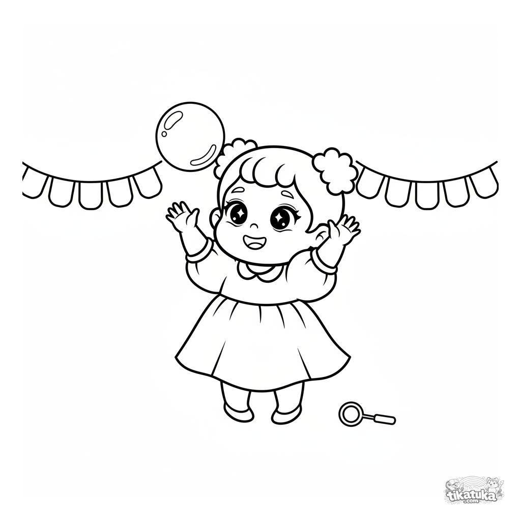 Раскраска для малышей 2-3 года: маленькая девочка в восторге тянется к большой мыльной пузыре в праздничном зале. Очень простые и крупные формы, огромные поля для раскрашивания.