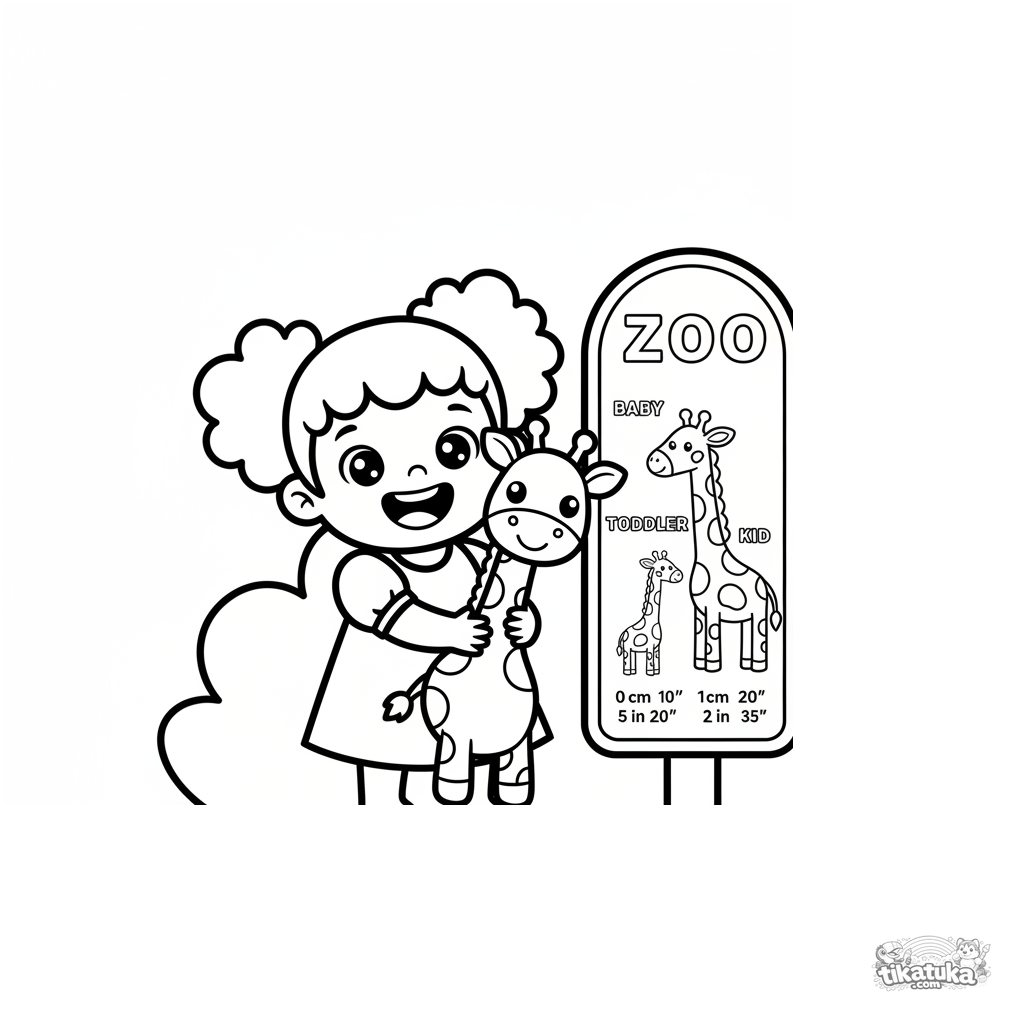 Простая раскраска для малышей 2-3 лет: девочка обнимает игрушечного жирафа у ростомерной таблички в зоопарке. Очень простые формы и много свободного места.