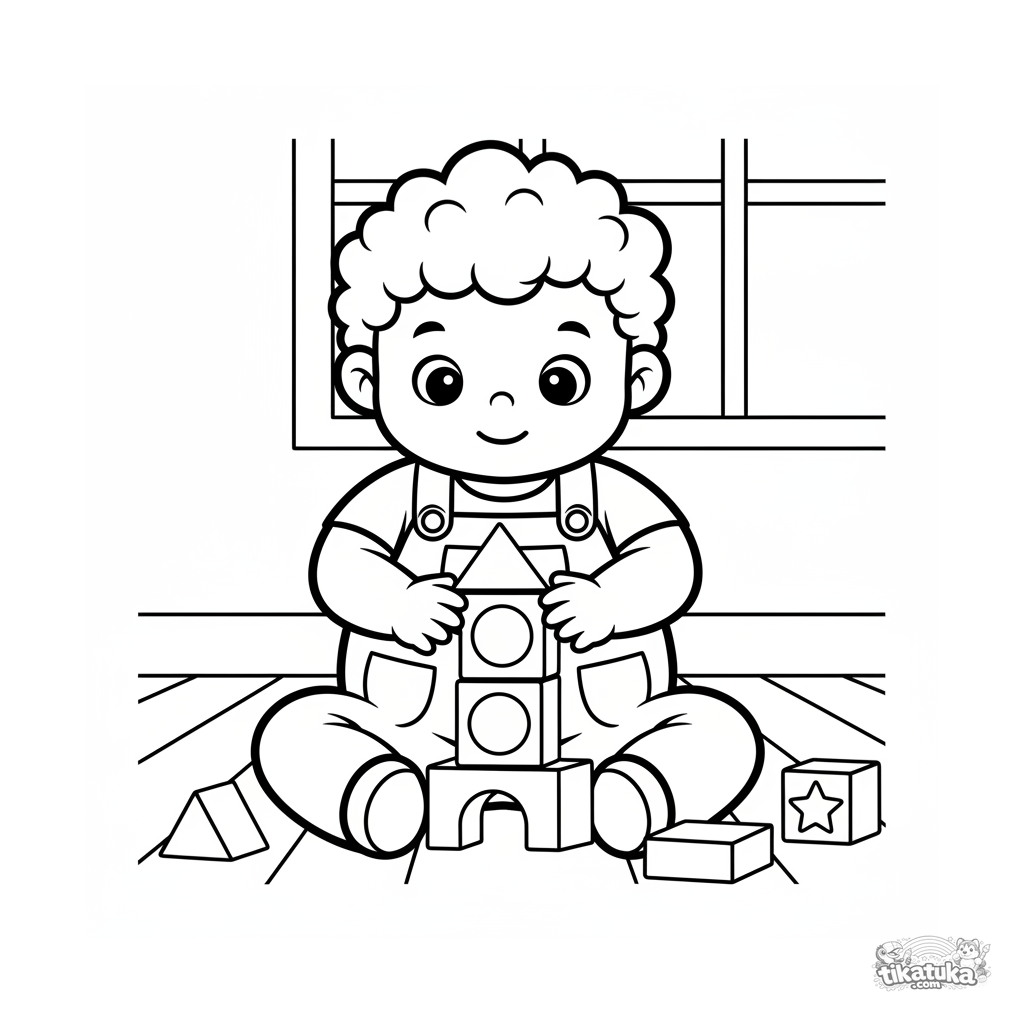 Очень простая раскраска для малышей 2-3 года: ребенок строит башню из кубиков в классе. Крупные четкие формы, идеально для первых карандашей.
