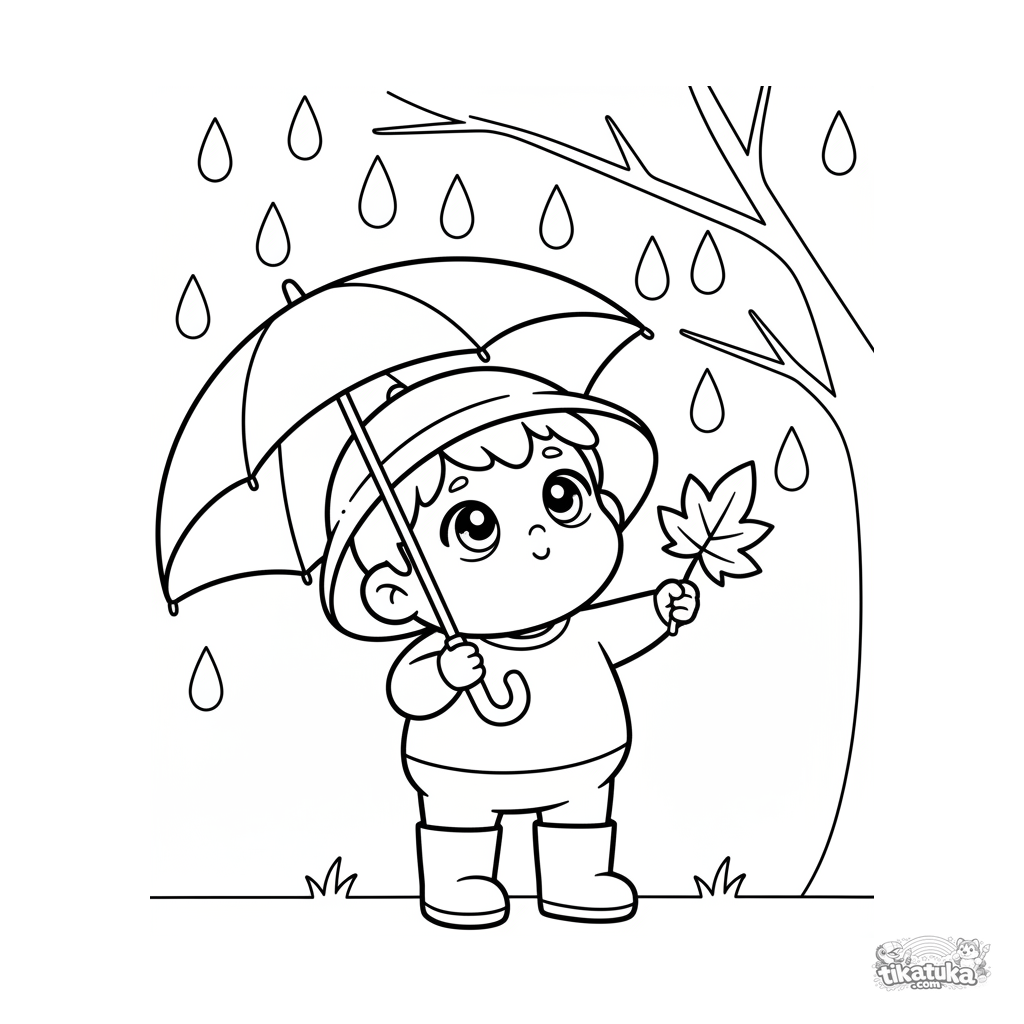 Простая раскраска для малышей 2-3 года: ребёнок в сапогах и дождевике стоит с зонтиком, наблюдая за каплями с дерева осенью.