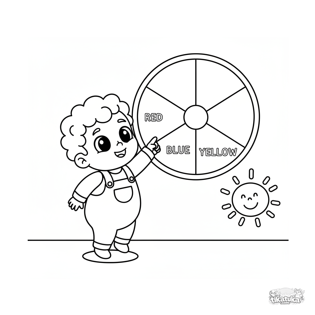 Очень простая раскраска для малышей 2-3 лет: ребенок у большого цветового круга на стене в детском уголке зоопарка. Крупные четкие формы.