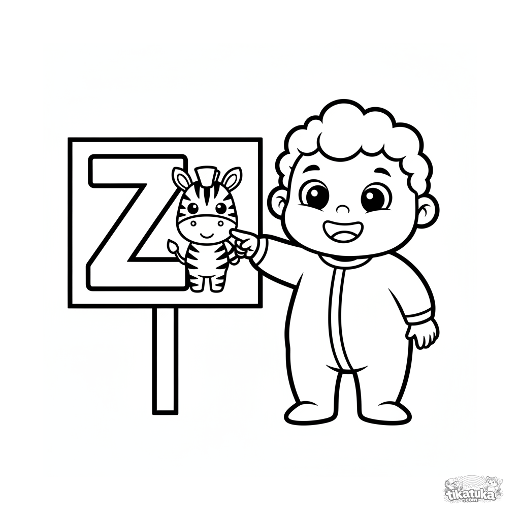 Раскраска для малышей 2-3 лет: ребенок показывает на большую букву Z и зебру на табличке в зоопарке. Огромные простые формы, первое знакомство с алфавитом.