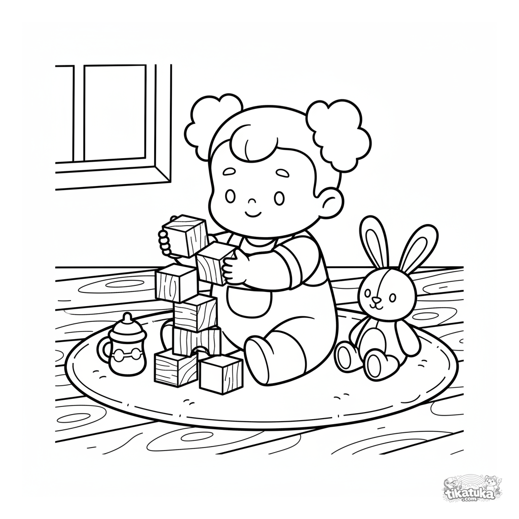 Очень простая раскраска для малышей 2-3 года: ребёнок строит башню из кубиков на полу веранды. Крупные формы, понятные контуры, идеально для первых попыток раскрашивания.