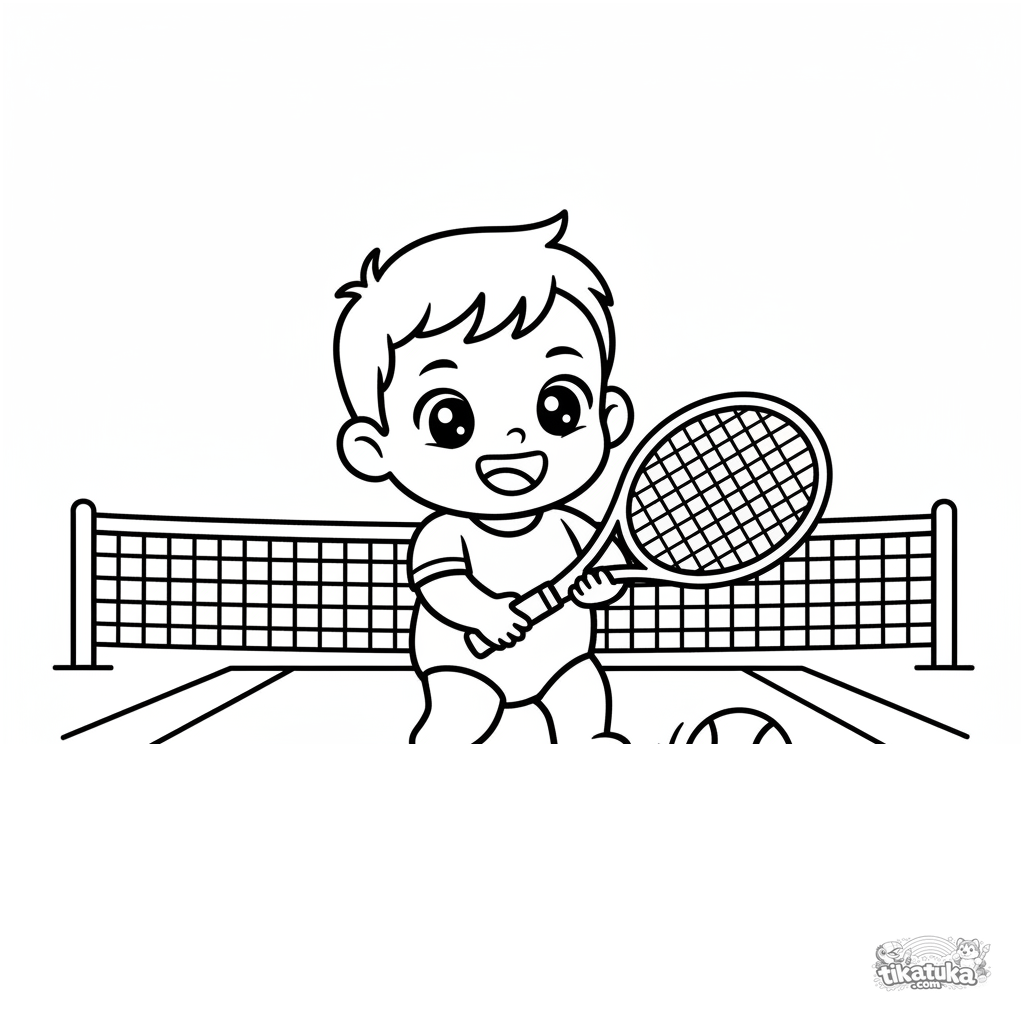 Простая раскраска для малышей 2-3 лет: весёлый малыш с большой ракеткой бежит за мячом на теннисном корте. Крупные формы, много свободного места для раскрашивания.