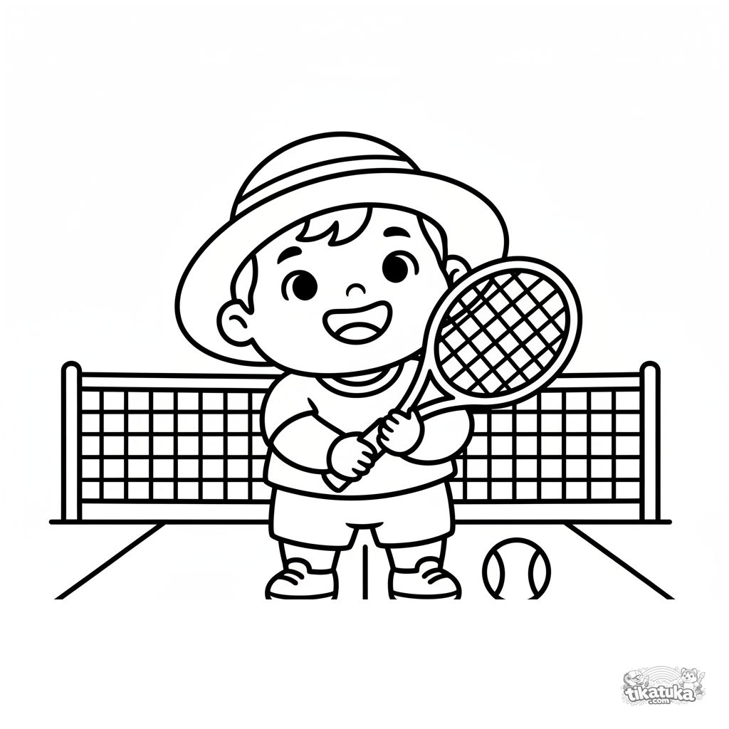 Раскраска для малышей 2-3 лет: счастливый малыш в шляпе стоит на теннисном корте с большой ракеткой. Простые формы, крупные детали, широкие поля для раскрашивания.