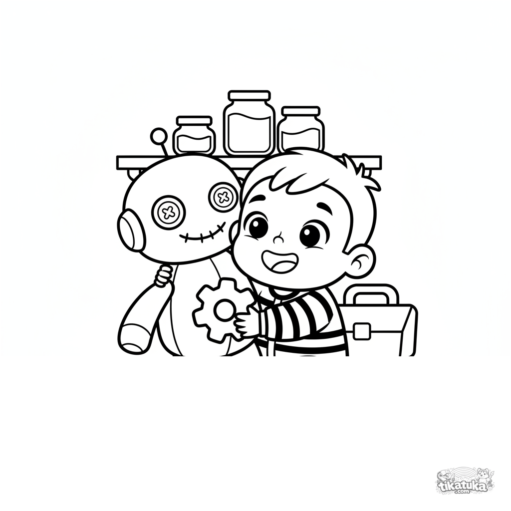 Простая раскраска для малышей 2-3 лет: маленький мальчик обнимает большого плюшевого робота-помощника в секретной лаборатории изобретателя.
