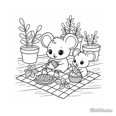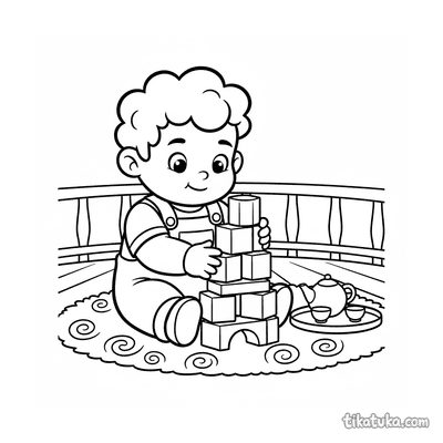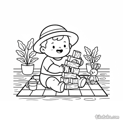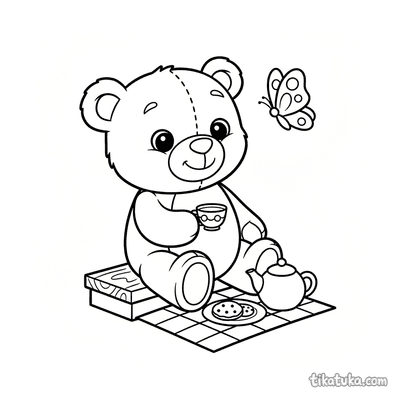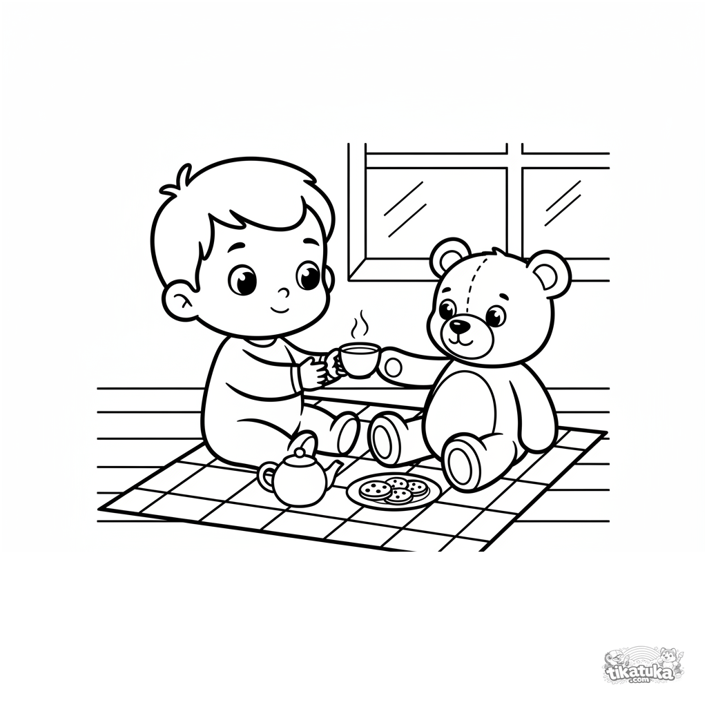 Простая раскраска для малышей 2-3 года: ребенок играет в чаепитие с плюшевым мишкой на одеяле на веранде. Крупные формы, мало деталей, идеально для первых карандашей.