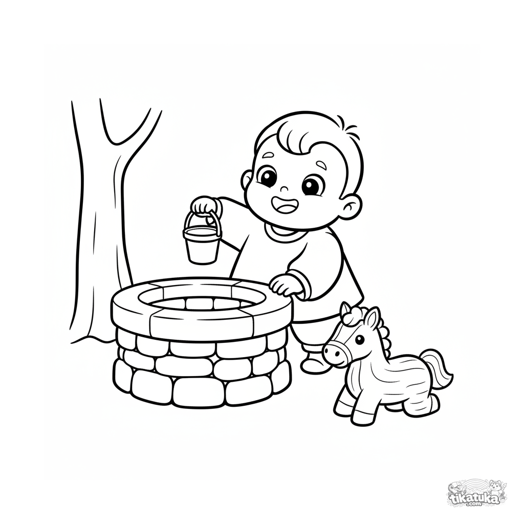 Очень простая раскраска для малышей 2-3 лет: ребёнок с игрушечным ведёрком у колодца. Крупные фигуры, толстые контуры, много свободного места.