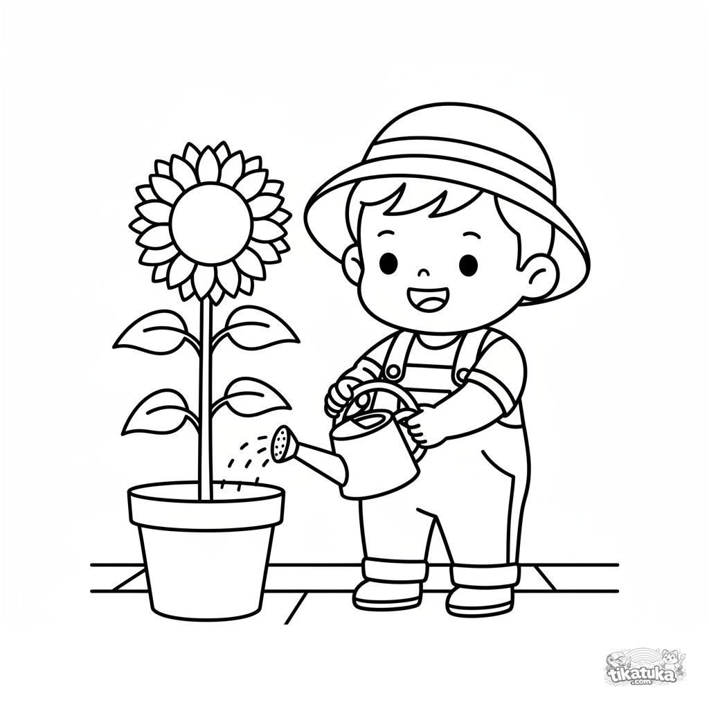 Простая раскраска для малышей 2-3 года: ребенок поливает большой цветок на веранде. Крупные четкие формы, широкие поля. Идеально для первых занятий с карандашами.