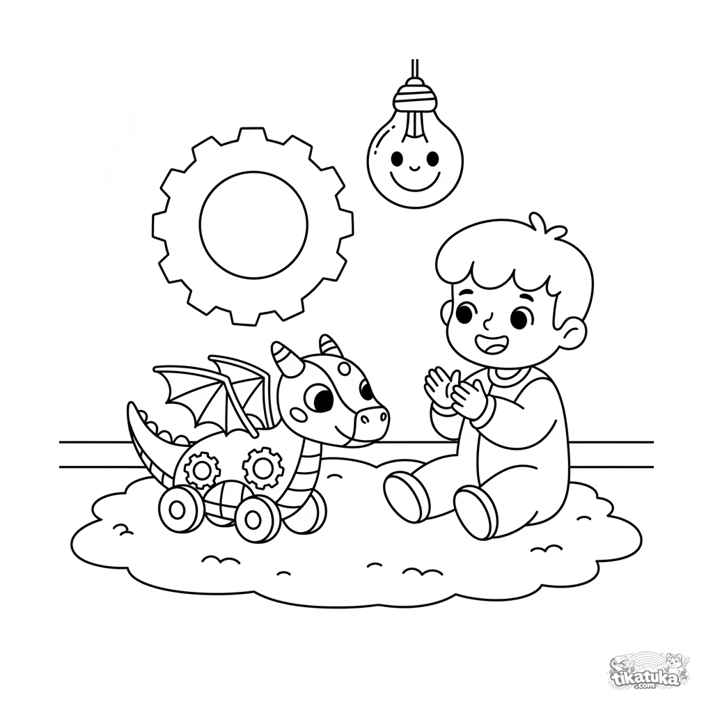 Очень простая раскраска для малышей 2-3 лет: мальчик в секретной лаборатории радуется заводному игрушечному дракону, большие формы для раскрашивания.